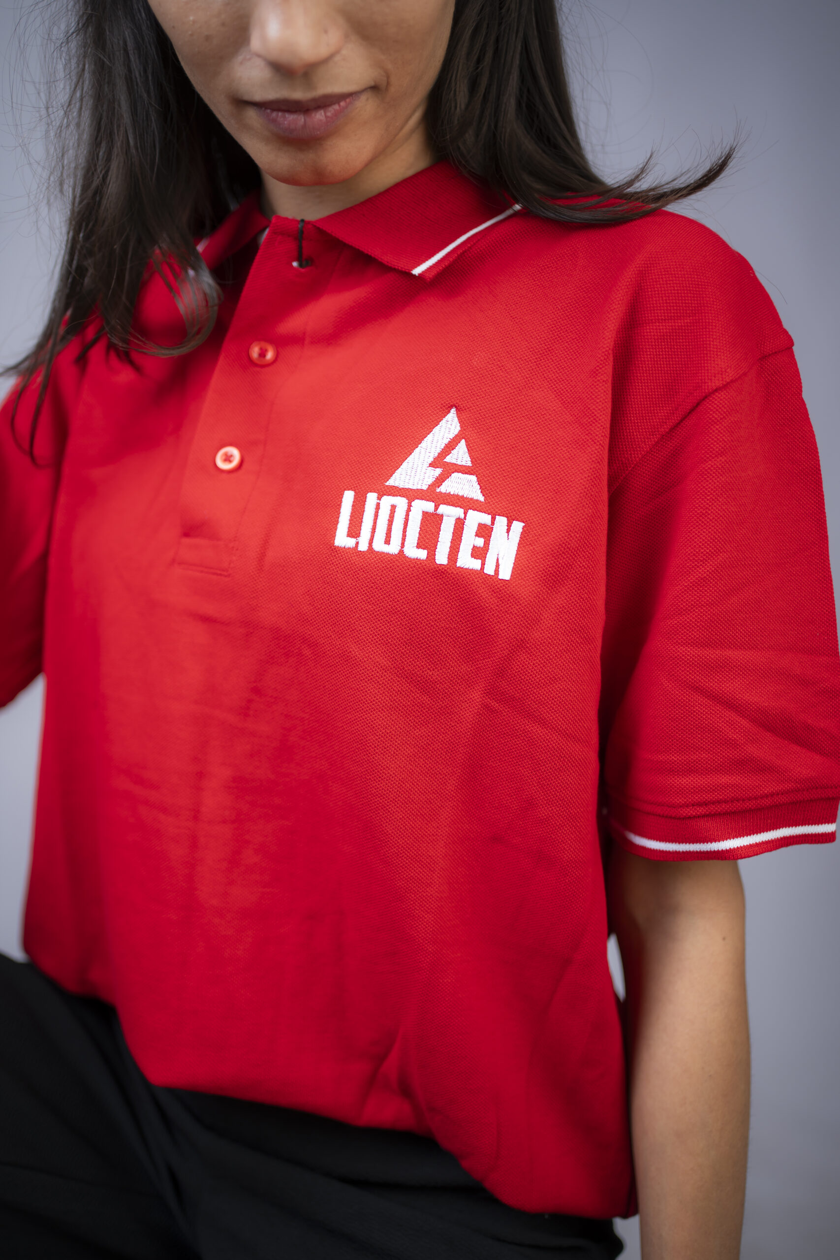 premium polo t-shirt, branded logo polo, luxury streetwear polo, red polo shirt, grey polo t-shirt, minimal logo polo, modern casual wear, DTF printed polo, LIOCTEN polo shirt